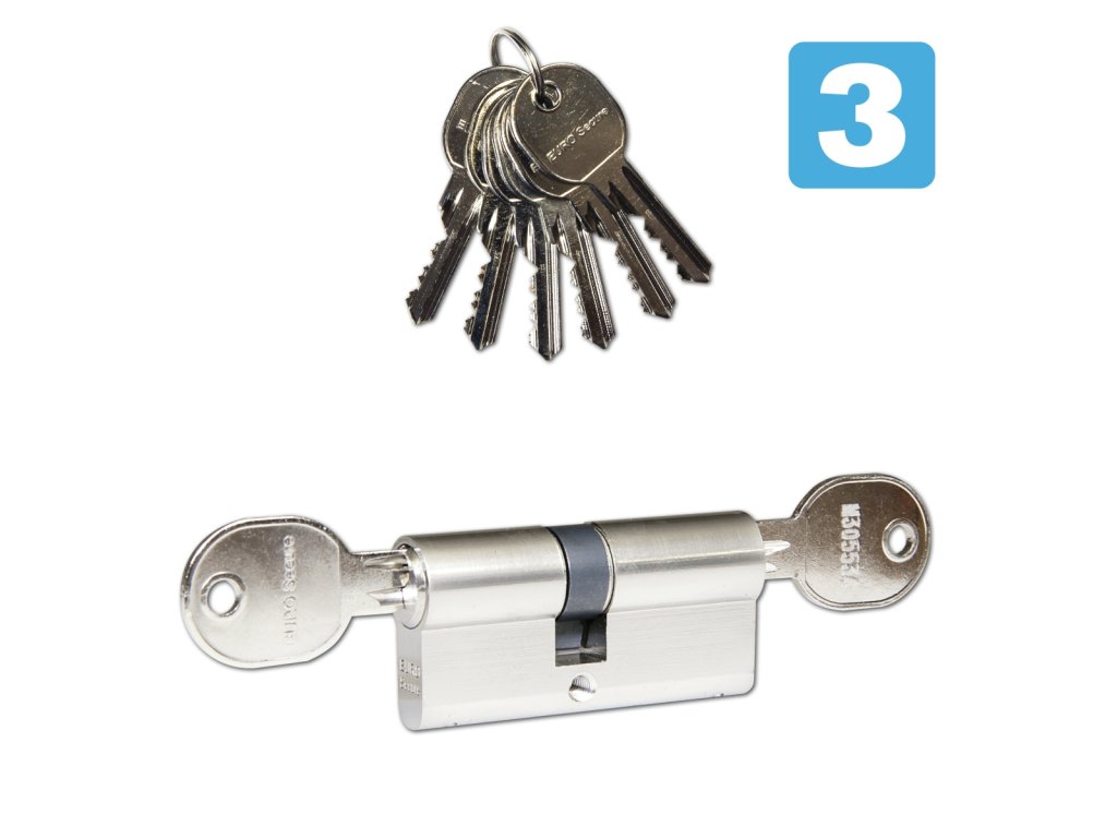 - Bezpečnostní 6stavítková vložka s odolností proti odvrtání a nedestruktivní dynamické metodě (tzv. bumping) a s prostupovou spojkou (BSZ) = vložka lze odemknout i při zasunutém klíči z druhé strany.